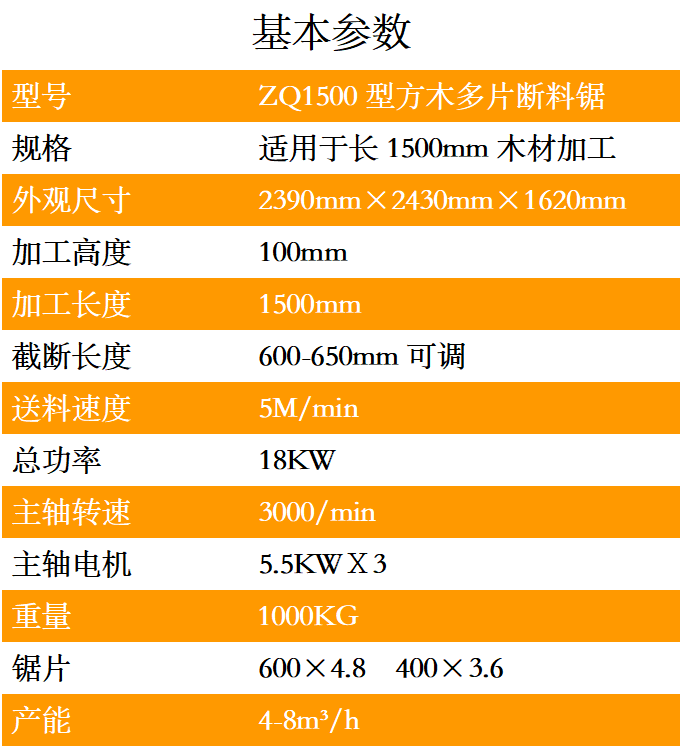 方木多片斷料鋸可加工木材長度1500mm,高100mm,截斷尺寸600mm-650mm之間可調(diào),送料速度5M/min,機身采用國標(biāo)鋼材、結(jié)構(gòu)緊湊、操作簡單、鋸面光滑、誤差小、效率高、故障率低。